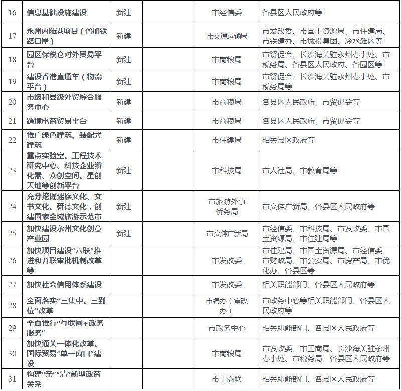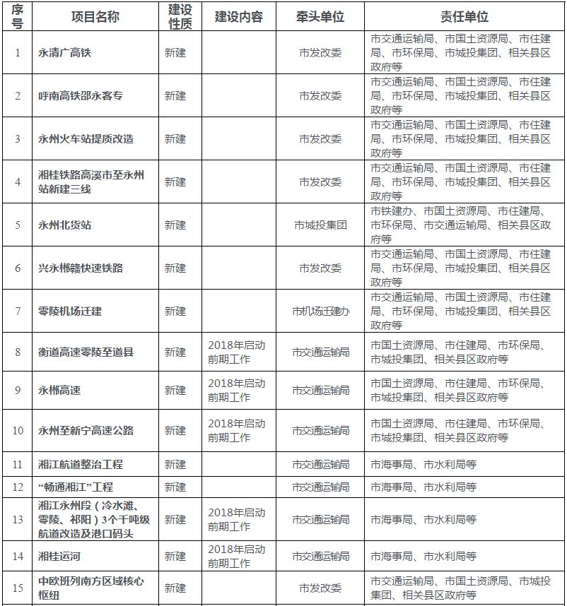 统筹抓好铁路、公路、水运、机场、城市公共交通设施建设,重点加快推进永清广高铁、呼南高铁邵永客专、永州火车站提质改造、湘桂铁路高溪市至永州站新建三线、永州北货站、兴永郴赣快速铁路、零陵机场迁建等重大项目建设,畅通西南出海、东盟经济走廊和北部湾地区等国际通道。启动衡道高速零陵至道县、永郴高速、永州至新宁高速公路前期工作;加快建设湘江航道整治工程以及“畅通湘江”工程,重点抓好湘江永州段(冷水滩、零陵、祁阳)3个千吨级航道改造及港口码头、湘桂运河等项目建设和项目前期工作;统筹湘粤桂跨境出海大通道国际联运,打造中欧班列南方区域核心枢纽;加快航空物流平台建设;加快信息基础设施建设,建立健全省市两级信息系统安全监测预警体系。(市交通运输局、市发改委、市住建局、市国土资源局、市环保局、市经信委、市水利局、市城投集团集团、市地方海事局、市机场迁建办、市铁建办等负责。列第一位的为牵头单位,下同)
