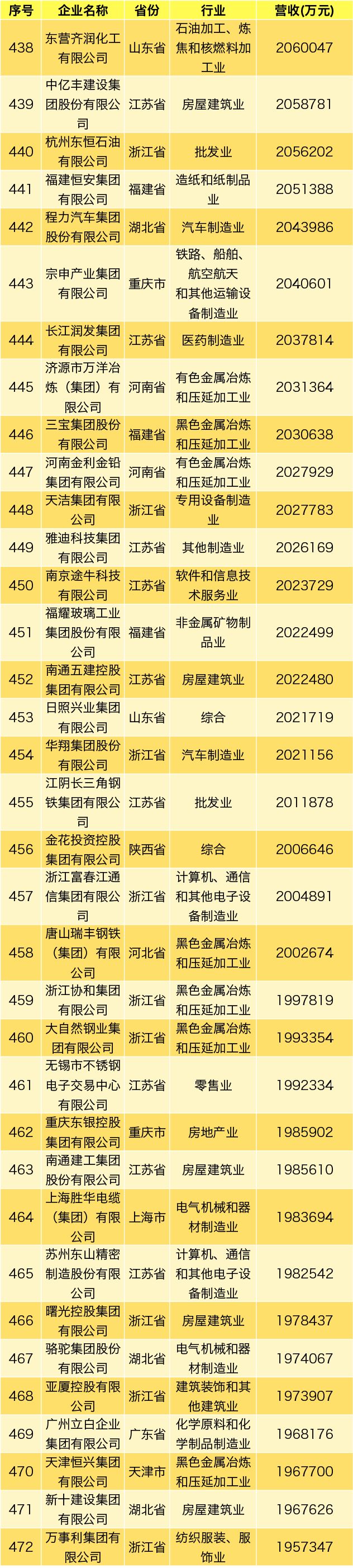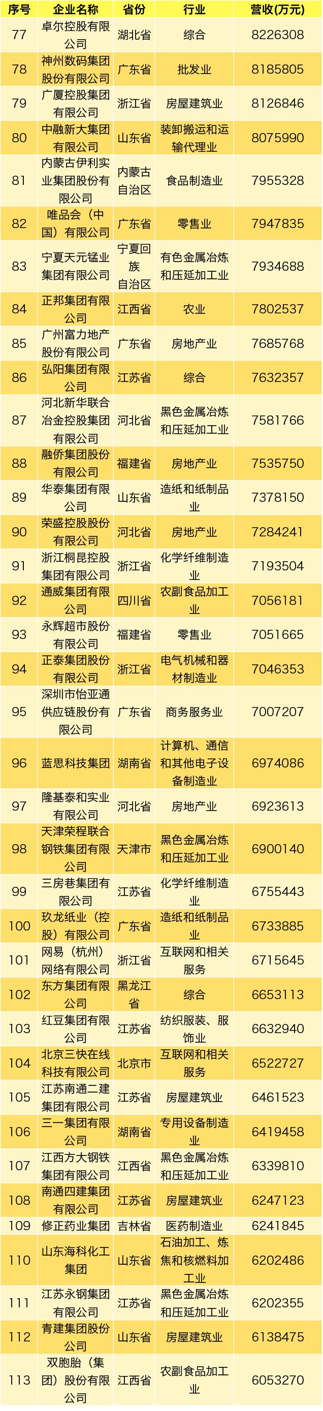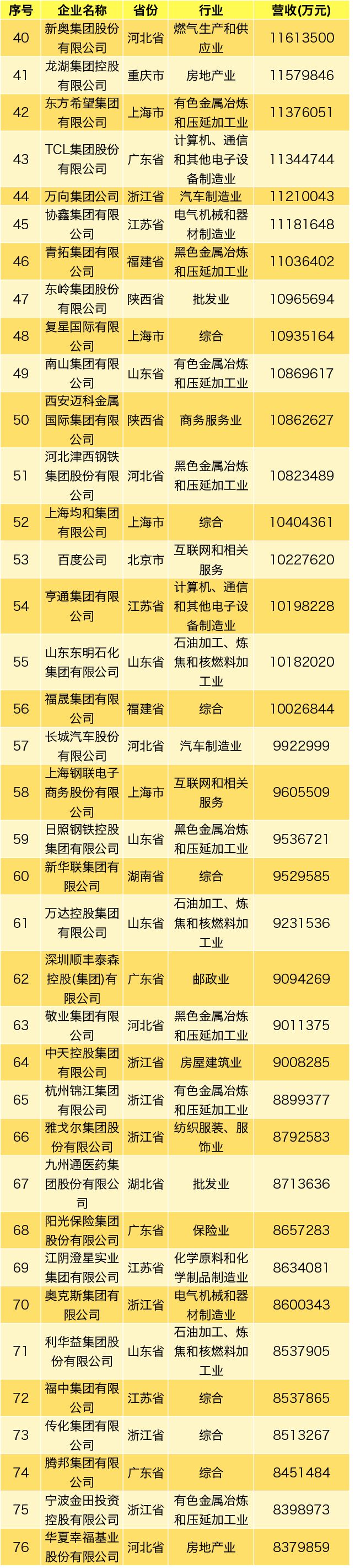 海航集团、苏宁控股分别以6182.93亿元和6024.56亿元的营业收入排名第二和第三位。正威国际集团、恒大集团、京东集团、碧桂园控股、恒力集团、联想控股、国美控股进入前十。本次500强上榜门槛为185.85亿。