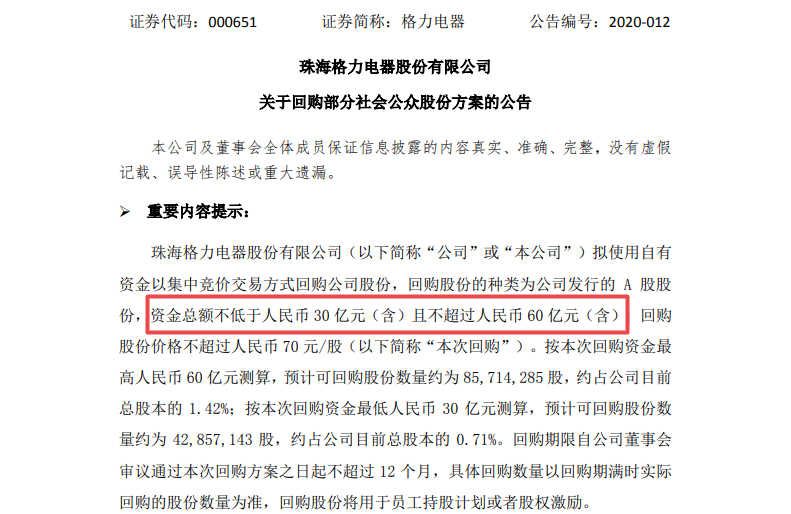 格力电器大手笔回购来了。4月12日,格力电器公告表示,公司拟使用自有资金以集中竞价交易方式回购公司股份,回购股份的种类为公司发行的A股股份,资金总额不低于人民币 30 亿元(含)且不超过人民币 60 亿元(含);回购股份价格不超过人民币 70 元/股。