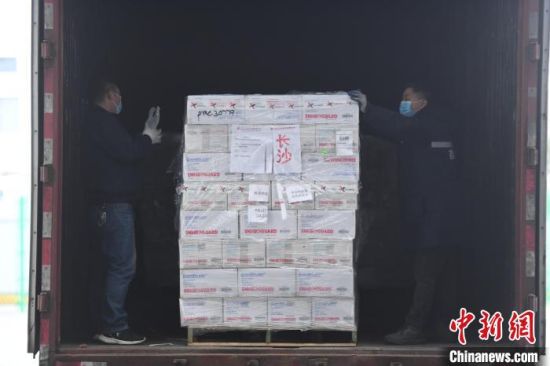 2020年2月1日,海外华侨华人募集和采购的防护服等防疫物资抵达长沙黄花国际机场。 杨华峰 摄