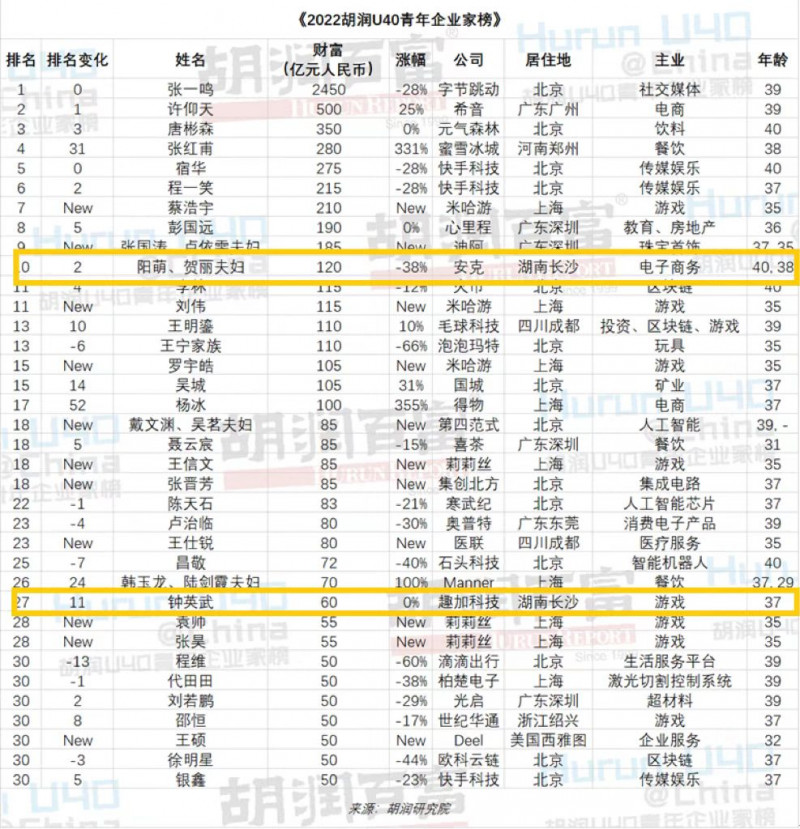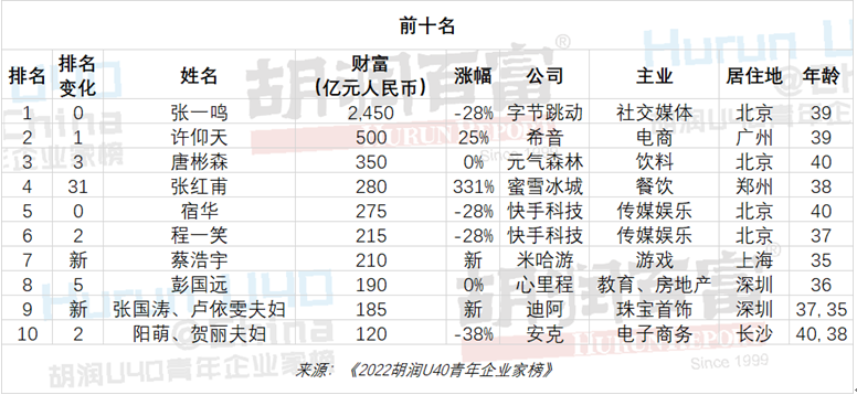 今日,胡润研究院发布《2022胡润U40青年企业家榜》,列出了今年胡润百富榜上40岁以下(含40岁)的白手起家的企业家,这是胡润研究院连续第七次发布此榜单。36位U40青年企业家进入50亿财富门槛的胡润百富榜,比去年少7位。其中,字节跳动的张一鸣以2450亿元财富蝉联40岁以下白手起家首富,居住地显示“长沙”的阳萌、贺丽夫妇(40、38岁)以120亿元财富重返前十,趣加科技钟英武以60亿元财富排在第27位。