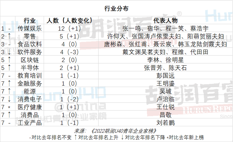 记者梳理发现,此次传媒娱乐行业上榜人数最多,共有12位,占榜单三分之一;其次是零售业5位,食品饮料业和软件服务各4位,前三名行业占榜单七成。