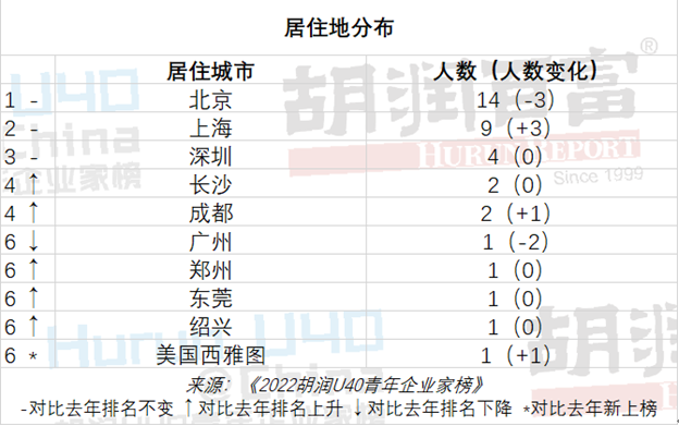 北京仍然是U40青年企业家最集中的城市,有14位,比去年少3位;上海以9位保持第二,比去年多3位;深圳以4位保持第三,与去年持平,前三大城市占榜单近八成。记者注意到,长沙和成都均以2位并列第四。